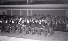 Negatief : 6 x 9 cm. - De academische zitting in de concertzaal. Schepen Emiel Vroome duoudt zijn toespraak.