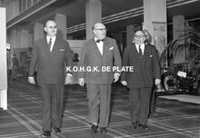 2 exemplaren, formaat : 13 x 18 cm. - De erehall. Vicepremier Paul-Henri Spaak, in het midden. Links, Roger De RamΓ©e, directeur van de Kursaal.