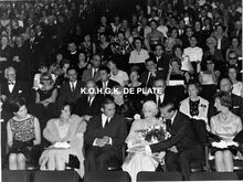 Formaat : 15,5 x 20,5 cm. - Koningin Elisabeth woont het concert bij van het Belgisch Kamerorkest met als dirigent Georges Maes. Solist : Erich Kunz (zang). Zij brachten een programma met werk van Mozart. We zien de koningin in het gezelschap van burgemeester Jan Piers en zijn echtgenote (rechts) en de provinciegouverneur Pierre van Outryve d'Ydewalle en zijn echtgenote. Links, mevrouw De RamΓ©e. Op de tweede rij, schepen Kamiel Dehouck en echtgenote. Achter de schepen, gemeenteraadslid Marcel Friederichs en echtgenote en naast hen, Frank Edebau, stadsconservator.