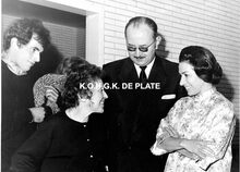Formaat : 17 x 23 cm. - De vernissage in de Montrosezaal. De kunstenaar in gesprek met schepen Roger De Kinder. In het midden, Frank Edebau, conservator van het Museum voor SchoneΒ Kunsten.