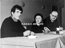 Formaat : 17 x 23 cm. - De vernissage in de Montrosezaal. Tentoonstelling ingeleid door schepen Roger De Kinder. Links naast hem, gemeenteraadslid Leo Porta. Rechts naast hem, Frank Edebau, conservator van het Museum voor Schone Kunsten en ernaast de kunstenaar. De oude man achteraan is de kunstschilder Emile Bulcke.