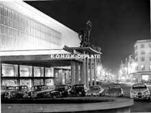 Formaat : 18 x 24 cm. - De zuidgevel van de vierde Kursaal. Boven de luifel van de hoofdingang, de sculptuur van Oscar Jespers "De Vier Elementen". Links, de bodega "Beaulieu". In 1961 was er voor de hoofdingang nog een halte voor de stadsbus.
