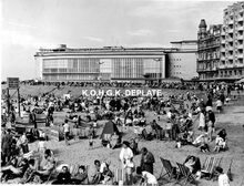 Formaat : 18 x 24 cm. - Strandrecreatie op het Groot Strand. We zien de westgevel van de vierde Kursaal langs de Albert I-promenade. Dit plekje wordt ook "Petit Nice" genoemd, daar het voor de genieters van de zeelucht, bescherming biedt tegen de soms gure noordenwind.