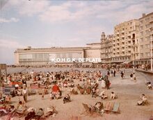 Formaat : 13 x 18 cm. - Genieten van de zeelucht op de Albert I-promenade. Foto genomen vanaf de badinstallaties richting de westgevel van de vierde Kursaal. Links, strandrecreatie op het Groot Strand.