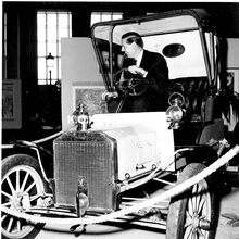 Foto : 13 x 18 cm. - Burgemeester Jan Piers in een oldtimer tijdens de opening van de tentoonstelling.