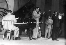 Formaat : 10,5 x 14,5 cm. - We zien : Billy Kyle (p), Trummy Young (tb), Louis Armstrong (tp) en Peanuts Hucko (kl). Verder bestond de band uit Mort Herbert (cb), Danny Barcelona (dm) en Velma Middleton (vc)