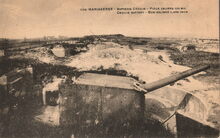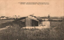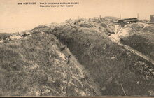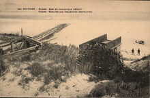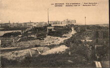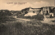 M.M.Br., Marco Marcovici. - Le Fort Napoléon. Travaux de défence boches. Fort Napoleon. Hun defence works. - Misleidende onderschriften. De batterij Eylau was gelegen op de oosteroever op het gedeelte dicht bij de haven, genaamd de "Halve Maan". We zien een gedeelte van de militaire bouwwerken gelegen nabij de Leopoldsluis.