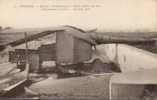 Henri Georges, éditeur, Bruxelles, N° 8. Ostende - Batterie "Hindenburg". Pièce calibre 320 mm. "Hindenburg" battery. 320 mm. gun. - We zien links, een glimp van de woningen, het meest noorderlijk gelegen op de oude vuurtorenwijk. De batterij was nauwelijks op enkele honderden meter gelegen en tijdens beschietingen vanuit zee vielen ook burgerlije oorlogsslachtoffers. Op de achtergrond rechts, de bebouwing langs de Zeedijk.