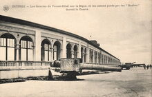 Walschaerts. - Ostende - Les Galeries de Palace-Hôtel sur la Digue, et les canons posés par les "Boches" durant la Guerre. - Wat overblijft van de batterij en daar staat als oorlogssouvenir. De gaanderijen van het Royal Palace zijn reeds herbouwd. Bij de installatie van de batterij werden ze door de Duitse bezetter afgebroken. - Map 029 E-42b