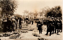 Gesneuvelde Duitse soldaten worden met militaire eer begraven op de begraafplaats langs de Nieuwpoortsesteenweg.