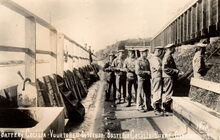 Onderschrift misleidend. - De batterij was gevestigd te Mariakerke. "De verblijven van de manschappen werden in de voet van de duin, aan de zuidzijde van de batterij opgericht. We zien de manschappen met hun gamel in de hand aanschuiven voor hun dagelijks rantsoen" (Erwin Mahieu).