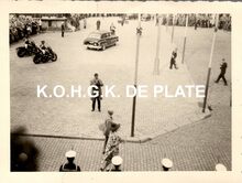 Formaat : 5,5 x 5,5 cm. - Overhandiging van bloemen aan Montgomery bij het binnentreden van het stadhuis
