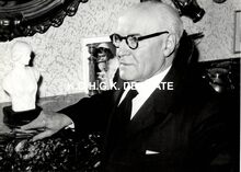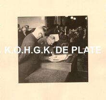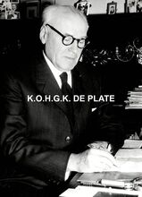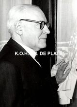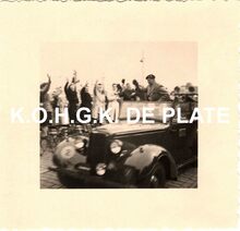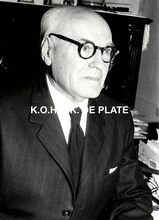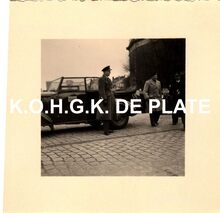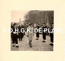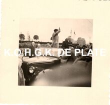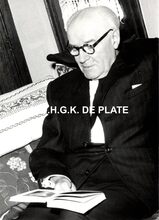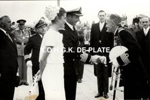 Formaat : 13 x 18 cm. - Titel onder voorbehoud, datum niet gekend (Georges Van Duyvenboden). - Ere commodore Georges Timmermans (rechts) verwelkomt de prins naar aanleiding van een tentoonstelling van de Zeemacht op de Dag van de Zeemacht. Naast de prins, de minister van landsverdediging P.W. Segers, kapitein-ter-zee Jules Delforge en een Brits militair