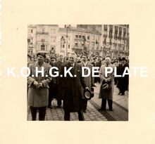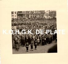 Formaat : 5,5 x 5,5 cm. - Een grote menigte voor het stadhuis