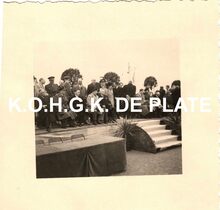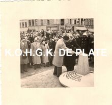 Formaat : 5,5 x 5,5 cm. - Inhuldiging van het Montgomerydok en onthulling van de gedenkzuil. Eerste schepen Emiel Vroome geeft tekst en uitleg over de gedenkzuil dat bij het bezoek van veldmaarschalk Montgomery aan onze stad ingehuldigd werd.