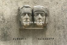 Oorlogsmonument gelegen in het plantsoen van de Sint Petrus- en Pauluskerk, nabij de Sint-Pieters- en Jozef II-straat. Dateert van 1968 naar een ontwerp van beeldhouwer August Michiels en architect J. Lewyllie. Gebogen muur, waarin de portretkoppen van Koning Albert I en Koningin Elisabeth met opschrift in bronzen letters "Albert" en "Elisabeth. Erachter los ervan rug aan rug geplaatste hoge muren met hoogreliëfs, restanten van het oud oorlogsmonument van 1922. Rechts : "Vlucht van de Oostendse vissers in 1914" met opschrift "Oostende Dover" en "Breidel". Links : "Bevrijding in 1918 of "Verdediging van het vaandel". Het geheel is afgesloten door lage gebogen betonnen muur met aan beide zijden het opschrift in bronzen letters : "Aan onze gesneuvelden en oorlogsslachtoffers 1914-1918 1940-1945"