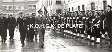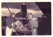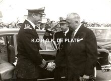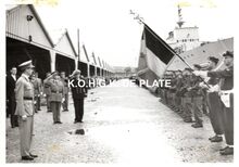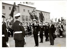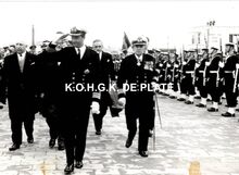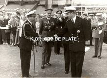 Formaat : 13 x 18 cm., beschadigd. - Koning Boudewijn groet het vaandel in aanwezigheid van o.a. : burgemeester Jan Piers, kapitein-ter-zee Jules Delforge. De "Kamina" aangemeerd in het Houtdok.