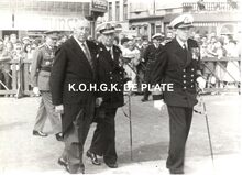 Formaat : 13 x 18 cm. - Datum niet bekend. - Minister P.W. Segers in het gezelschap van (?) en vooraan, kapitein-ter-zee Jules Delforge. Hier langs de Visserskaai.