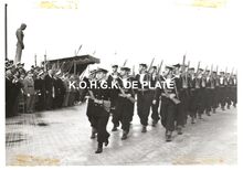 Formaat : 13 x 18 cm., beschadigd. - De troepen defileren voorbij de eretribune nabij het Monument der Zeelieden. We herkennen o.a. van links naar rechts : de schepenen Kamiel Dehouck en Roger De Kinder, kapitein-ter-zee Jules Delforge, burgemeester Jan Piers...