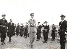 Formaat : 13 x 18 cm. - Prins Albert in gezelschap van : Kapitein-ter-zee Jules Delforge, de gouverneur van de provincie West-Vlaanderen Pierre van Oytryve d'Ydewalle, een glimp van Achille Van Acker (toen voorzitter van de Kamer van volksvertegenwoordigers ?) en de minister van landsverdediging P.W. Segers. Rechts, een ere detachement van de Zeemacht met op de achtergrond het clubhuis van de Royal North Sea Yacht Club.