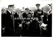 Formaat : 13 x 18 cm. - Titel onder voorbehoud, datum niet gekend (Georges Van Duyvenboden). - Ere commodore Georges Timmermans (rechts) verwelkomt de prins naar aanleiding van een tentoonstelling van de Zeemacht op de Dag van de Zeemacht. Naast de prins, de minister van landsverdediging P.W. Segers, kapitein-ter-zee Jules Delforge en een Brits militair
