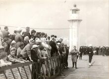 Formaat : 13 x 18 cm. - Het gezelschap op "'t koptje van 't hoofd", het Weststaketsel, in aanwezigheid van veel publiek. Het ijzeren torentje met mistbel.