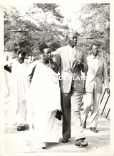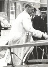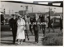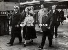 Formaat : 13 x 18 cm. - Zij kwamen aan in het Zeestation en waren op doorreis naar Engeland. We zien de vorst in het midden acheraan, met links schepen Maurice Quaghebeur sr. en rechts stadssecretaris Michel Surmont. De vorstin wordt vergezeld door de stationschef en de commandant van de pakketboot. Meer info in het Kustblad van 22/04/1959, p.4.