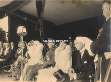 Formaat : 18 x 24 cm. - Burgemeester Edouard Moreaux houdt zijn toespraak naar aanleiding van de plechtige inhuldiging van het Leopold II monument. We herkennen van rechts naar links, burgemeester Edouard Moreau, Prins NapolΓ©on de zoon van Prinses Clementine, Prinses Clementine, Koning Albert, Koningin Elisabeth...