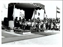 Formaat : 11 x 14,5 cm. - De eretribune op het Zeeheldenplein. Van links naar rechts, de provinciegouverneur van West-Vlaanderen Pierre van Outryve d'Ydewalle, Koningin Fabiola, Koning Boudewijn en burgemeester Jan Piers. De koning en de koningin in gesprek met twee kinderen.