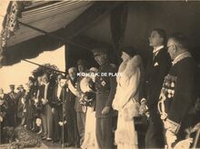 Formaat : 18 x 24 cm. - Koning Albert houdt zijn toespraak naar aanleiding van de plechtige inhuldiging van het Leopold II-monument op de Zeedijk. We herkennen van rechts naar links, burgemeester Edouard Moreaux, Prins NapolΓ©on de zoon van Prinses Clementine, Prinses Clementine, Koning Albert, Koningin Elisabeth, LΓ©opold Hertog van Brabant, minister Jules Renkin...