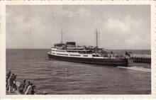 Nels, serie Ostende, nr. 79. - Ostende - La RentrΓ©e de la Malle. - De pakketboot "Princesse Josephine" vaart de haven van Oostende binnen. Links, een excursieschip aangemeerd aan het Weststaketsel. Rechts, het Ooststaketsel