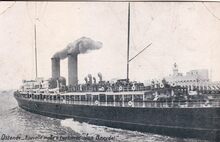 Edit.Β V.G. [=Victor GrΓ©goire], avenue du Pidi, Bruxelles. - Ostende -Β DΓ©part de la malle Ostende-Douvres. - De raderstoomboot "Marie-Henriette" in de havengeul van Oostende. We zien het ooststaketsel en de tweede vuurtoren.