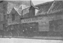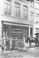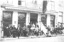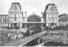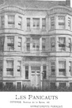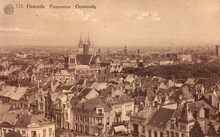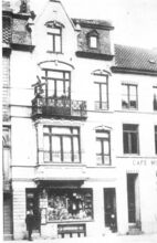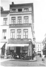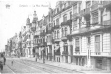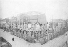 De bouw van de Koninklijke Schouwburg) (ThéÒtre Royal), op de hoek van de Vlaanderenstraat (links) en de Van Iseghemlaan (rechts). Aannemer Joseph Sanders uit Oostende voerde de werken uit naar de plannen van architect Alban Chambon. Aan deze foto is een kleine anekdote verbonden !. Enkele fotografen hadden een weddenschap aangegaan, wie na gelijktijdige opname, het eerst een foto zou ontwikkelen en afmaken. Fotograaf Lebon won met deze foto de weddenschap