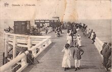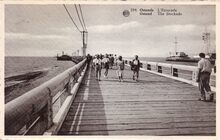 Star, NΒ° 2364. - Ostende - L'Estacade. - We zien het einde van het Weststaketsel, of "'t koptje van 't hoofd". Er was ook op het einde een cafΓ©-paviljoen waar je een drankje kon nuttigen en genieten van de gezonde zeelucht. Het was voor de toeristen en Oostendenaars een favoriete wandelroute. Vooraan links, een gehandicapte man met krukken. Met de renovatie van de havengeul en het bouwen van de strekdammen is ook het cafΓ©-paviljoen verdwenen.