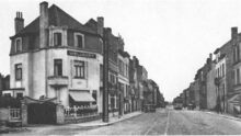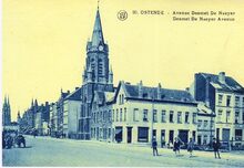 Zicht van de Nieuwpoortsesteenweg, gezien vanaf de hoek van de Aartshertogstraat richting Elisabethlaan. Links, het hotel "Au Coq d'Or". De stoomlijn op de linkerzijberm van de Nieuwpoortsesteenweg richting Oostende. Bemerk ook de bakwagen op het uitwijkspoor rechts van de weg
