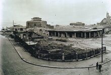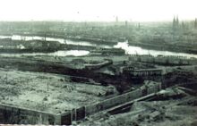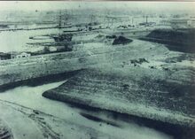 Foto : (kopie), formaat :Β 15 x 10 cm. - Dempen van de Leopoldspuikom. Aanleg van de eerste sluis (vooraan) naar het Visserijdok. Op de achtergrond, het Zeewezendok, de havengeul en het centrum van de stad.