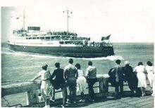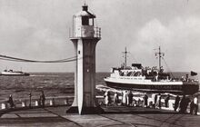 De carferry "Prinses JosΓ©phine-Charlotte" vaart de haven van Oostende binnen. Vooraan, het ijzeren torentje met mistbel op het einde van het Weststaketsel