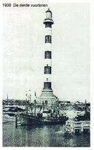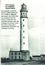 Foto (kopie), formaat : 9 x 13 cm. -Β De tweede vuurtoren werd in 1859 gebouwd en in 1860 in gebruik genomen. Ze stond aan de oostkant van de haven ongeveer op dezelfde plaats waar de huidige vuurtoren staat. De toren werd op 7 september 1915 door de Duitsers vernield
