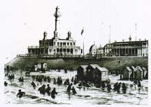 Zwart/wit foto Antony 150934. Formaat : 10,5 Β x 15 cm. β Het eerste stedelijk zwembad en zwemschool werd opgericht Β tussen 1894-1895 en was gelegen nabij de Β watertoren aan de Gistelsesteenweg (nu Mercatorlaan) en vlakbij de ingang van de brug naar de Koninginnelaan. Ongeveer waar nu de Groendienst gevestigd is. Wegens het grote succes diende men in 1896 badcabines bij te bouwen.