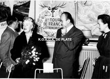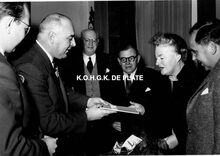 Formaat : 13 x 18 cm. - Plechtige ontvangst op het dienstdoend stadhuis (Gerechtshof) van Gracie Fields in aanwezigheid van links naar rechts : Roger De RamΓ©e, directeur van het Kursaal, schepen Maurice Quaghebeur sr. die haar een werkje over Oostende overhandigt, Stadsecretaris Michel Surmont, (?), Gracie Fields en haar echtgenoot Boris Alperovici.