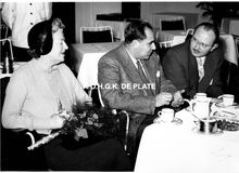 Formaat : 13 x 18 cm. - Gracie Fields in gezelschap van haar echtgenoot Boris Alperovici en Roger De RamΓ©e, directeur van het Kursaal. Hier in het restaurant "Le PΓ©rigord". Zij ontving de pers op 21/12/1954 en trad op in de Ambasadeurszaal van 24-26/12/1954