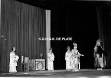 Formaat : 13 x 18 cm. - Plechtige ontvangst op het dienstdoend stadhuis (gerechtshof). Rechts, schepen Maurice Quaghebeur sr.