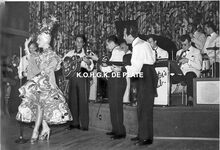 Formaat : 13 x 18 cm. - Hier in de Night Club "La Champagne" omringd door Juan Carioca en La Banda Lu. Op de achtergrond :Β "The Rectors Club Orchestra"