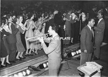 Formaat : 13 x 18 cm. - De Ambassadeurszaal. Vera Lynn wordt begroet door Roger De RamΓ©e, directeur van het Kursaal. Op de achtergrond, het orkest "Eddie Warner"