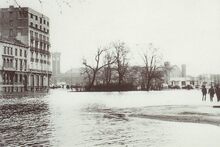 Tropic T 424. - Ostende oender woater 1953. - Het Vissersplein en zicht op de Sint-Vincentius Meisjesschool in de Ooststraat. - Inventaris 2020/1293 fotoarchief D2 album 3. Herkomst : Simoens