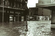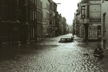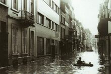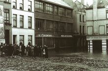 Tropic T 428. - Ostende oender woater 1953. - De Nieuwstraat richting Mijnplein. Op de hoek met de Schippersstraat, café 't Klein Ijsland - Inventaris 2020/1290 fotoarchief D2 album 3. Herkomst : Simoens