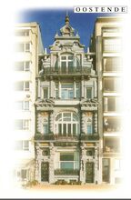 J.V.D.B., n° 102/3. - De noordgevel van de vierde Kursaal langs de Van Iseghemlaan. Op de luifel van de hoofdingang, de sculptuur "De Vier Elementen" van beeldhouwer Oscar Jespers. Op de hoek van de Van Iseghemlaan en de Langestraat het "Hôtel Bel-Air". In het midden, de woontoren "Europacentrum".