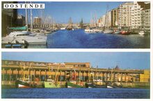 Tropic T 352. - Multikaart met 2 foto's. - Boven: De Mercator jachthaven bestaande uit het eerste en tweede handelsdok. Rechts, de Vindictivelaan en links, de Leopold III-laan. Op het einde het stadhuis gelegen langs de Leopold II-laan ; Onder: Kustvissersvaartuigen gemeerd langs de kaai van het Tijdok, naast de vismijn