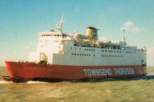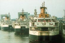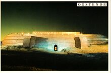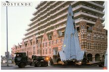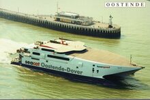 Tropic T 281. - We zien "'t koptje van 't hoofd", of het einde van het Weststakestel, het café-paviljoen en het ijzeren torentje met mistbel . De SeaCat "Rapide" van Hoverspeed Oostende-Dover verlaat de haven van Oostende