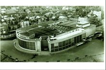 Tropic T 496. - Kursaal Oostende (collectie : Erwin Mahieu). - Luchtopname van de west- en noordgevel van het vierde Kursaal, gelegen langs de Albert I-promenade. Gebouwd naar de plannen van architect Leon Stynen. Foto, periode, 1953-1954, want we zien nog steeds de littekens van de Tweede Wereldoorlog. Links, de Kursaal-Oosthelling moet nog worden herbouwd.